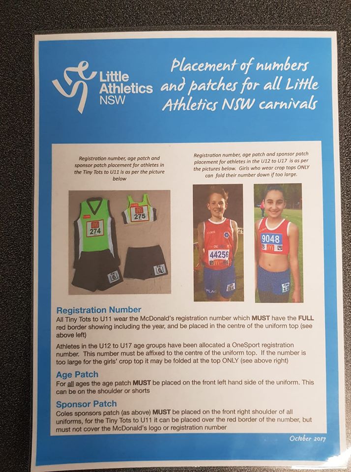 The age group number needs to be clearly visible, attached to either side of the TWLA singlet or crop or OR either leg of the shorts.
